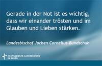 Karlsruhe, (13.03.2020). Im Blick auf die Coronakrise drückt Landesbischof Jochen Cornelius-Bundschuh in einem Brief an alle Kirchengemeinden seine Zuversicht aus, dass Kirche im Vertrauen auf Gott Wege finde, die Menschen aufzurichten und zu einem verantwortungsvollen Mit- und Füreinander zu ermutigen. Gerade in der Not sei es wichtig, dass „wir einander trösten und im Glauben und Lieben stärken“, so der Bischof.